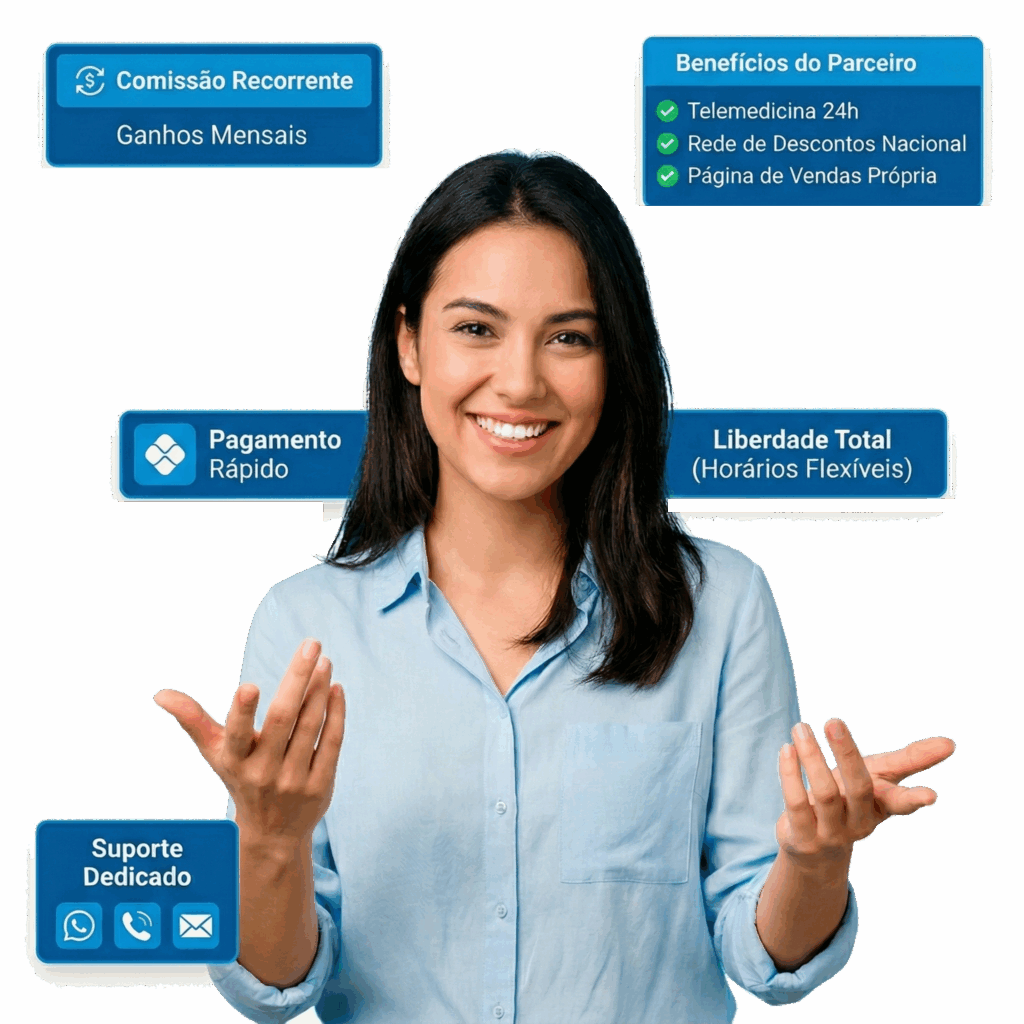 Compartilhe com sua rede. A cada venda realizada, você garante sua comissão mensal enquanto o cliente estiver ativo.